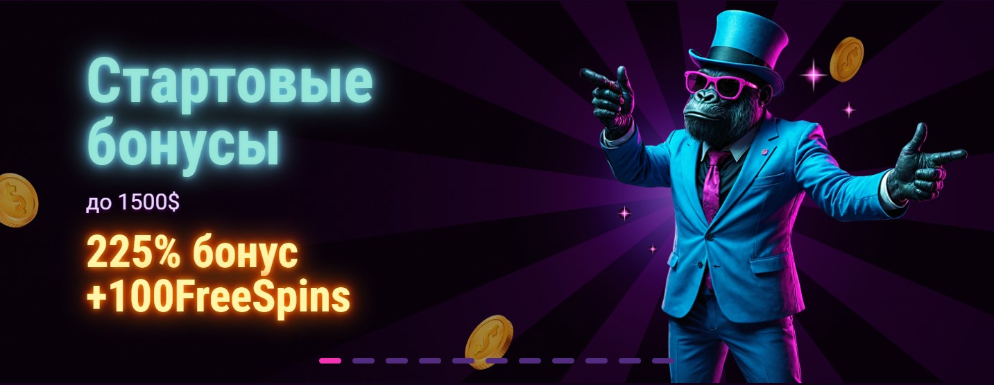 Новые игроки получают щедрый приветственный бонус: 225% к первому депозиту + 100 фриспинов. Для активации бонуса используйте промокод при пополнении счета.